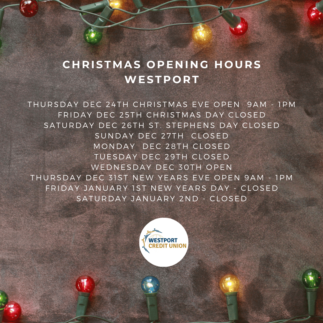 It’s Christmas time again, at the end of an extraordinary year. Thank you for choosing to be part of Westport Credit Union. We have had, like most people around the world, a very different year. One with new business challenges but also one with new perspectives.This last year, we’ve had to prioritise the health and safety of all our members – staff, and their families. We hope that 2021 will be a BIGGER & BRIGHTER year for all of us and that business will return to normal as soon as it is safe to do so. Until then we thank you for your patience and support throughout 2020 and we look forward to seeing you in the New Year.